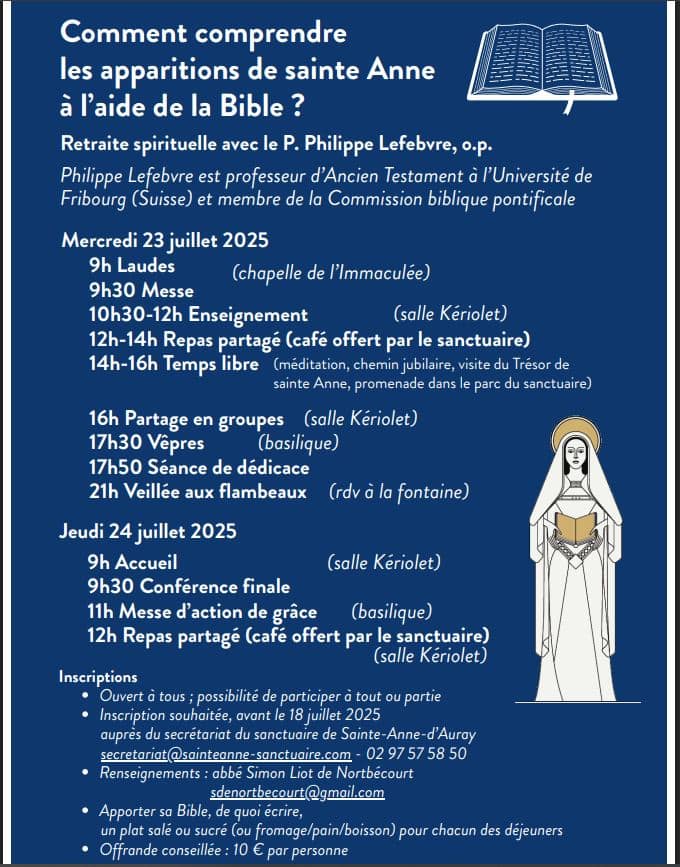 Principaux sujets abordés :– pèlerinage au Calvaire de Pontchâteau, en juin 25– 3 jours exceptionnels pour clôturer le jubilé de Ste Anne, en juillet 25– pardon de Notre Dame du Roncier, à Josselin, en septembre 25– Lire la suite