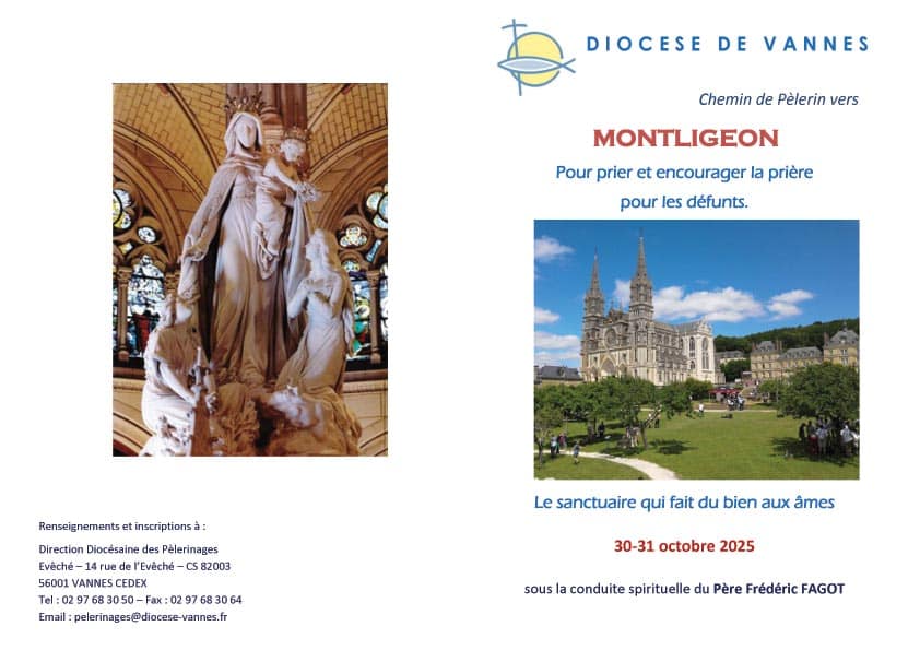 Ne me souvenant plus avec qui j’ai évoqué le prochain pèlerinage au sanctuaire de Montligeon les 30 et 31 octobre prochain organisé par la Direction Diocèse de Vannes, je me permets de vous adresser ce message ! Vous trouverez en pièces jointes les informations nécessaires : Il reste quelques places…